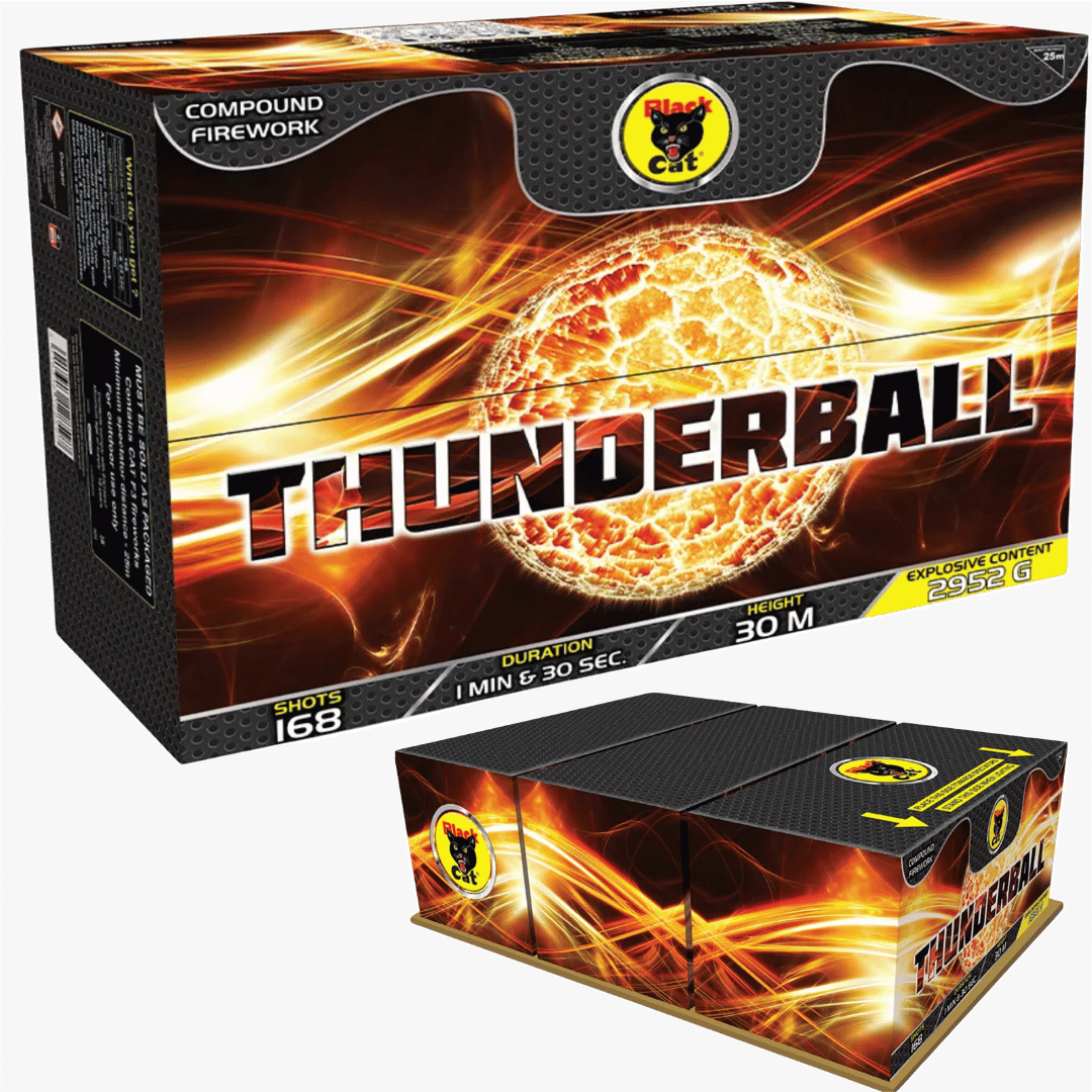 Starting with red tails to bursts of red and blue stars with fizzing palms, purple and green stars with fizzing palms followed by a double fanned volley of deep red dahlia with silver strobe and orange dahlia with green strobe. Gold tiger tail comets rise to burst of gold king crowns with green strobe and the same golden tails to gold palms with blue stars. Continuing it’s variety of firing patterns, Thunderball delivers a W firing section of gold brocade palms with red and green strobe flanked by red and green strobe to time rain fizzing stars. More gold glitter crowns to silver glitter follow before a stunning finale of volley after volley of fanned deep red strobe mines to red and green strobe to time rain crackle and bright white strobe mines to the same above!