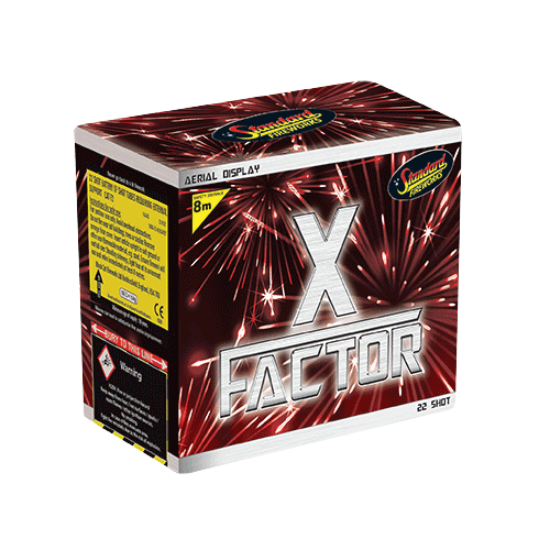 X-Factor by Standard Fireworks is a vivid 22 shot cake, both straight and V-firing.